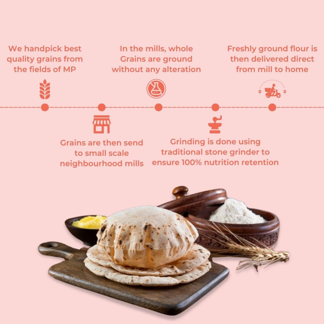 Made from whole wheat grains directly sourced from from MP Sehore and traditionally stone ground for you